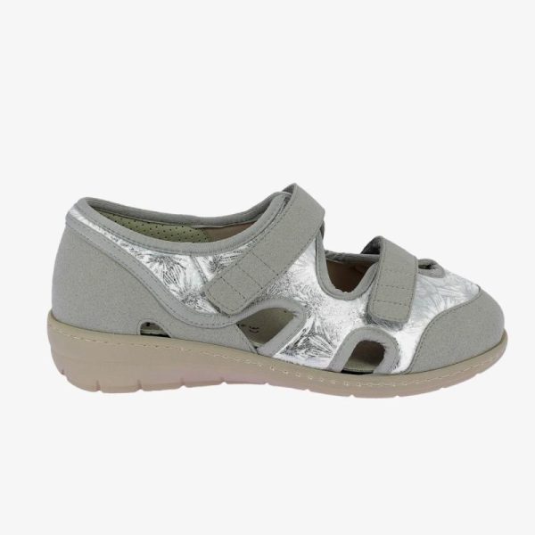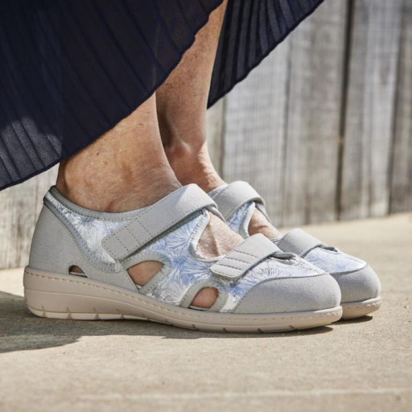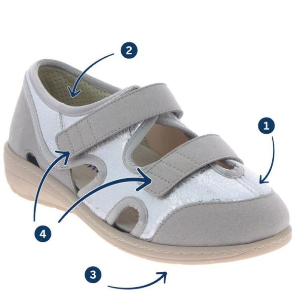 La sandale thérapeutique Genny est spécialement pensée pour offrir protection et adaptation afin de convenir à de nombreuses spécificités du pied. Cette sandale fermée est conçue pour accueillir et protéger les orteils déformés et volumineux grâce à un cuir protecteur sur le bout avant de la chaussure. Le tissu de la sandale est très extensible pour s’adapter aux déformations du pied et offrir un maximum de confort et de souplesse. La bordure de Genny est douce et souple pour protéger la cheville en cas d’oedème qui gongle. La grande ouverture permet un chaussage à plat et les 2 longues brides permettent un réglage précis de la chaussure. L’arrière enveloppant offre un bon maintien de la cheville, assurant la stabilité lors de la marche. La Genny est dotée d’une semelle intérieure en cuir pour plus de confort, qui peut être échangée ou retirée en cas d’utilisation de semelle sur mesure.